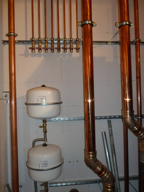 Detailansicht der Heizungsanlage: Die Rohrmontage ist weitgehend abgeschlossen, die Dämmung kann in Kürze erfolgen.