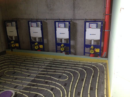 Die Toilettenanlage mit verlegten Fußbodenheizungsleitungen auf der Dämmung.