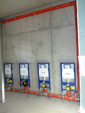 Detailansicht WC Anlage mit WC Installationsblöcken und schallgedämmten Abwasserleitungen sowie Umlüftungsleitung