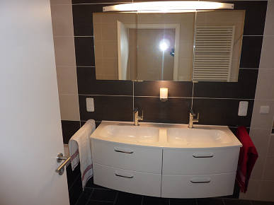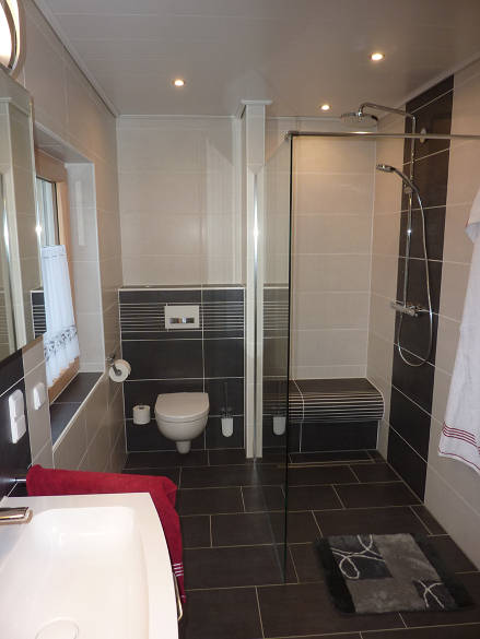 Badsanierung Ein echtes Spaßbad mit bodengleicher Dusche, Badewanne und viel Platz auf vergleichsweise geringer Fläche.